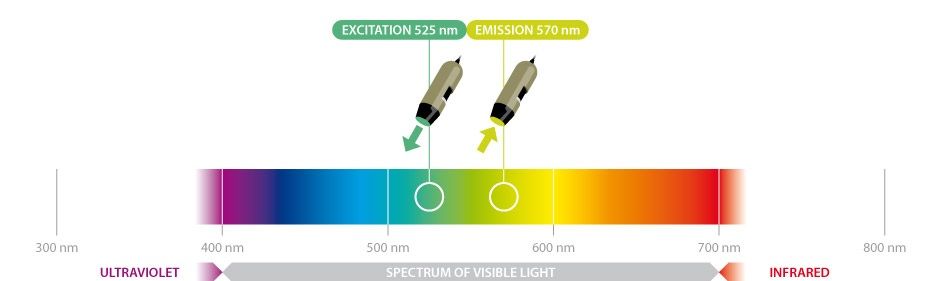 Dino-Lite AM4115T-YFGW digitalt mikroskop är optimerat för forskning och visning av fluorescerande föremål med hjälp av 525nm lysdioder. Den har ett 570nm emissionsfilter som är utformat för att observera men inte begränsat till Cy3 och TRITC.